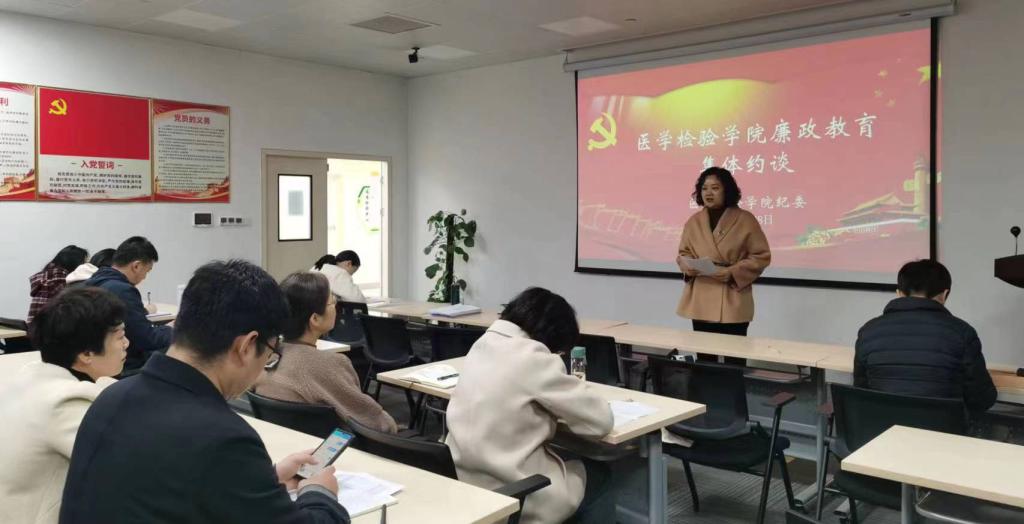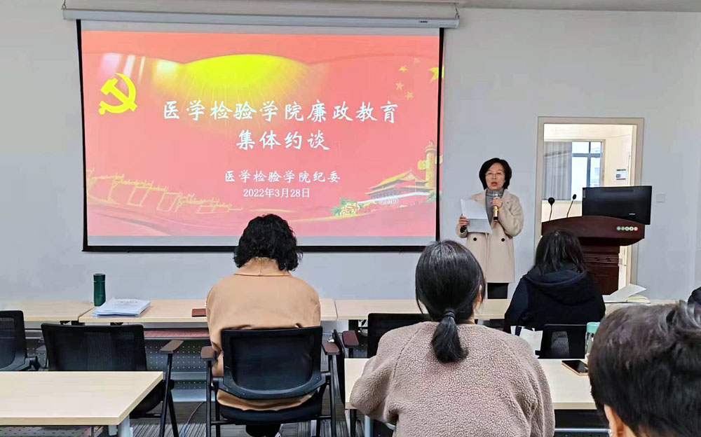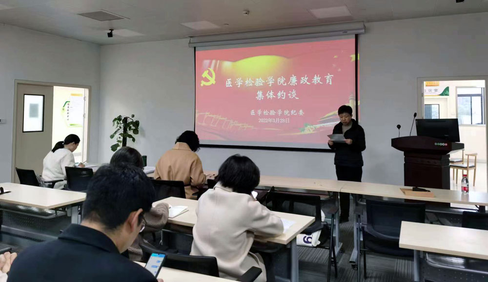 副经理费樱、党委委员谭玉洁结合工作实际,对研究生复试、临床检验中心耗材管理等问题进行了集体约谈,针对可能存在的风险点,提醒干部职工警醒,切实加强防控。会上观看了警示教育片《清风云南》。