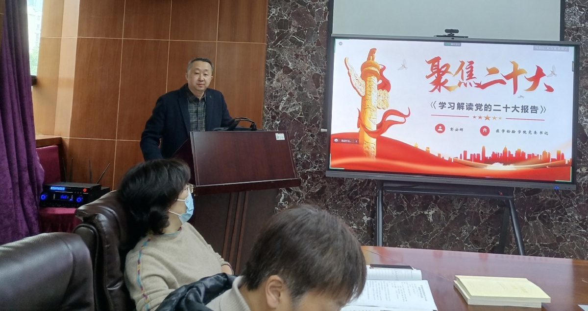 据此,11月29日,在北校区基础2号楼三楼会议室,威廉希尔体育党委书记彭安辉以“聚焦二十大《学习解读党的二十大报告》”为题,通过线上线下结合给全体教工党支部党员及员工党员 。