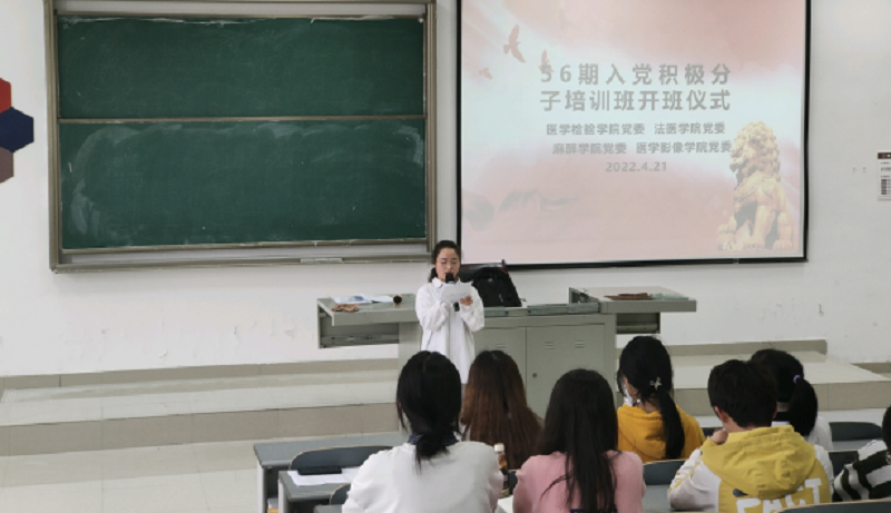 开班仪式在全体起立,齐唱国歌中开始。随后,医学检验技术2021级入党积极分子刘婵娟代表全体学员进行发言并向党组织做出庄严承诺。法医公司员工党支部书记张佳佳代表教师发言:“希望全体学员能够珍惜机会,尊重老师劳动成果,认真听讲,深刻领悟,不断提升政治素养和理论水平,争取早日加入中国共产党。”。